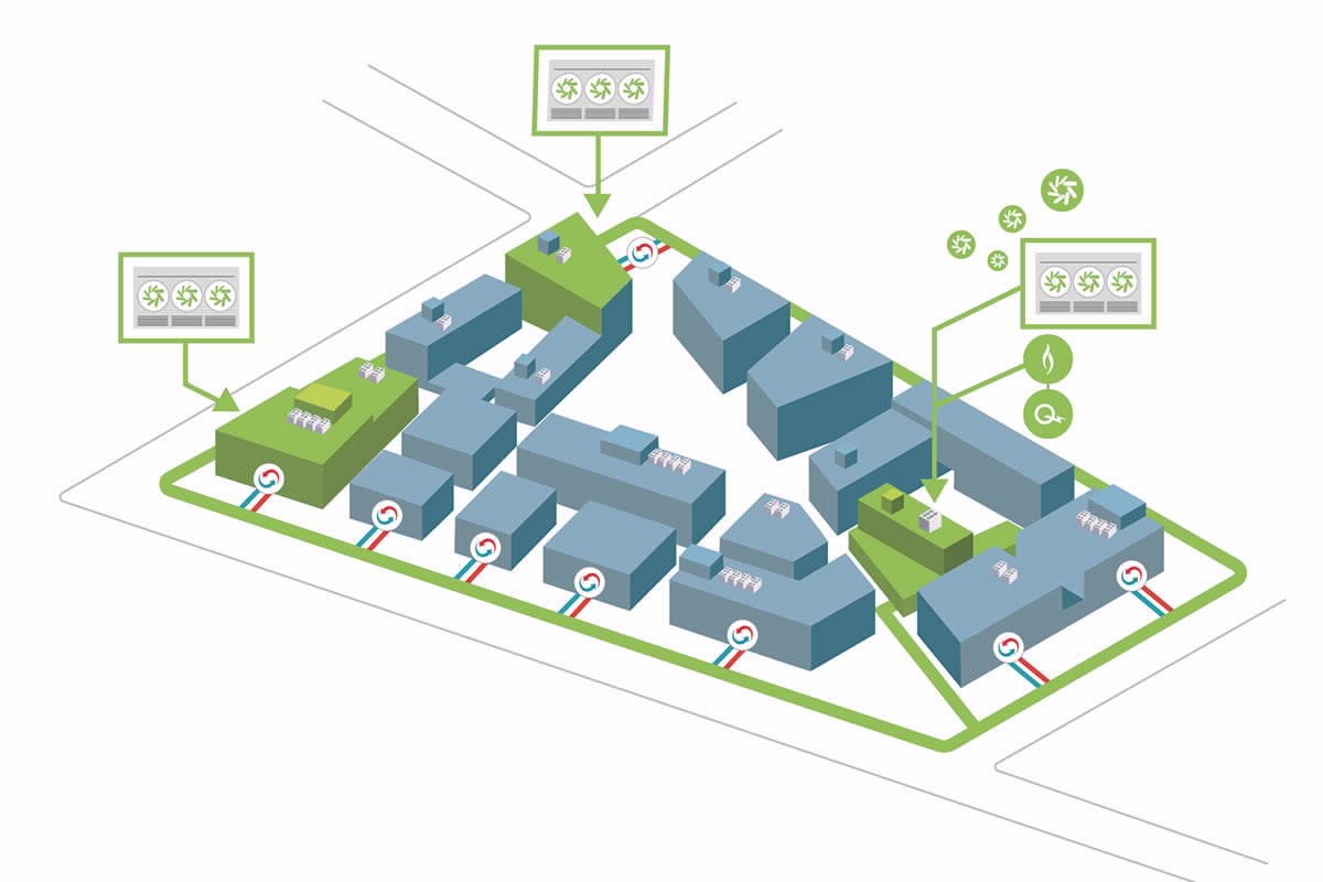 À la différence des autres types de réseaux de chaleur, celui de quatrième génération repose sur le principe d’un réseau d’eau à température neutre proche de la température ambiante (plus ou moins 15 degrés Celsius), couplé à des sources d’énergie renouvelables et utilisant des thermopompes pour chauffer ou climatiser des bâtiments.