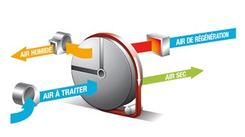 La roue dessiccante utilise le principe d’absorption. Les matériaux dessiccants attirent l’eau grâce à une couche de faible pression de vapeur. Les matériaux typiquement utilisés peuvent retenir jusqu’à 10 000 % de leur poids lorsqu’ils sont secs.