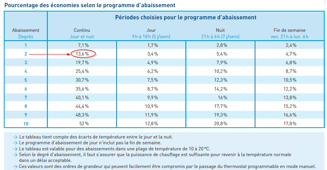 Tableau extrait de la fiche « Abaissement de la température ambiante », Énergir, le nouveau Gaz Métro.