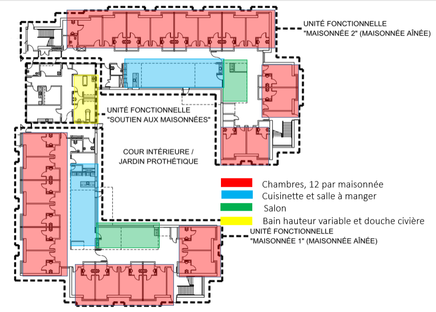 - Créer des unités fonctionnelles de 12 chambres avec leurs espaces de soutien dédiés, comme dans le schéma d’un étage typique présenté à droite.