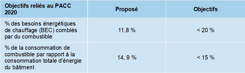 - Réduire les GES : respect des critères 2 et 3 du PACC2020, soit une utilisation maximale des combustibles de 20 % pour les besoins énergétiques (BEC) et de 15 % de la consommation totale (CTA).