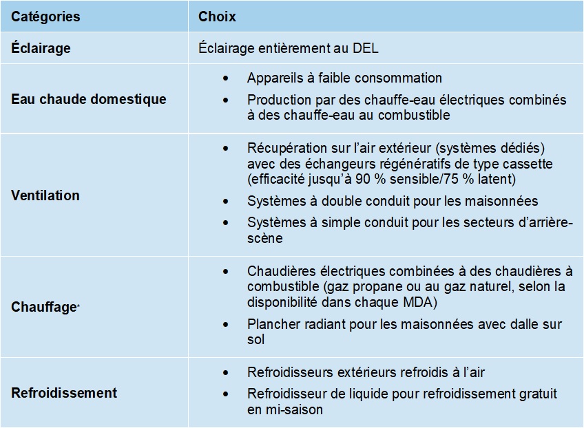 Lors des premières ébauches, une stratégie tout à l’électricité a été envisagée, mais, compte tenu du requis de redondance des chaudières en cas de panne de courant, des génératrices de capacité imposante étaient requises.