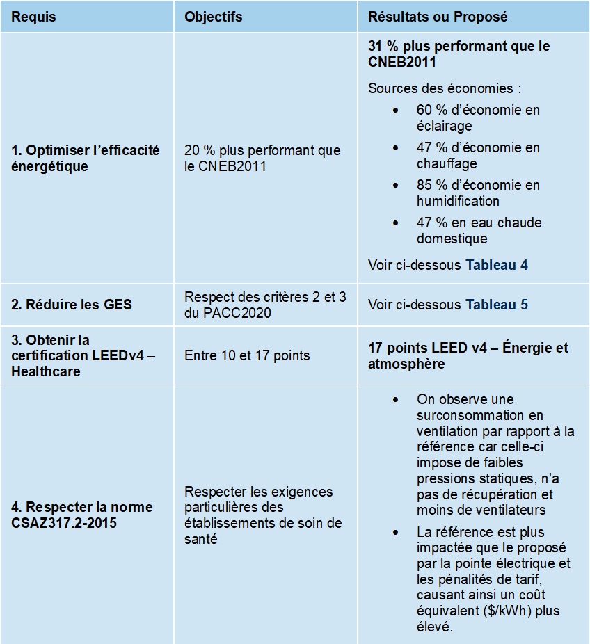 - Obtenir la certification LEEDv4 – Healthcare : le nombre de points pour le crédit Énergie et atmosphère varie entre 10 et 17 points selon les bâtiments.