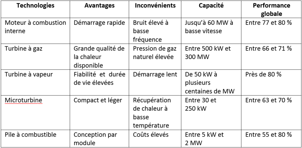Tableau 1 – Avantages, inconvénients et caractéristiques des technologies de cogénération [1]