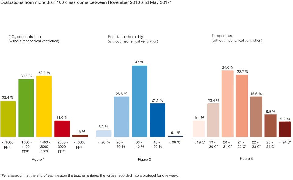 Malgré cela, la figure ci-dessous nous indique que les taux de CO2 se sont révélés être excessivement élevés. Dans plus de 13 % des mesures réalisées à la fin de la leçon, le taux de CO2 était supérieur à 2000 ppm, ce qui représente la valeur limite supérieure pour les concentrations de CO2 dans les pièces occupées selon la norme SIA 180. La figure 2 nous indique que l’humidité relative était inférieure à 30 % dans un quart des mesures, ce qui pourrait donner lieu à des complications pour la santé, par exemple le dessèchement des muqueuses des voies respiratoires. La poussière, la saleté et les microbes ne sont alors pas éliminées des voies respiratoires assez rapidement. Si ces éléments restent longtemps dans les voies respiratoires, les risques de maladies respiratoires augmentent. Parmi les conséquences caractéristiques, on note les toux, la bronchite, les rhumes et les infections des sinus. La seule bonne nouvelle, que l’on peut constater à la figure 3, c’est qu’à de rares exceptions près, la température en degrés Celsius se situait dans une plage acceptable.