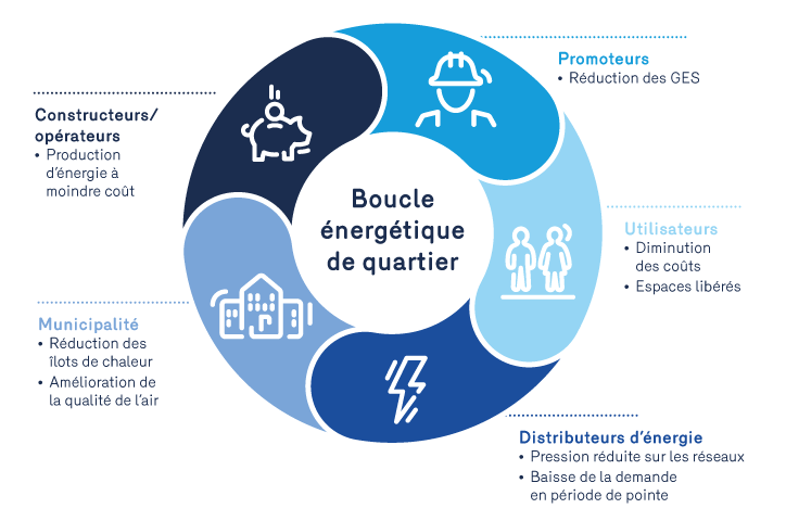Cette mise en commun de l’énergie présente des avantages économiques et environnementaux pour chaque groupe impliqué dans un projet de boucle énergétique, et ces avantages créent un « cercle vertueux » dont chacun profite et fait profiter les autres. Le schéma présenté ici-bas illustre bien cette idée voulant que si chacun met l’épaule à la roue, tous y trouve son compte.