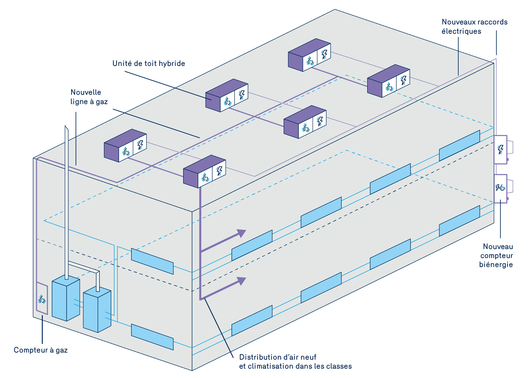 Cette configuration permettrait de chauffer ou de climatiser les écoles en fonction de la saison, en plus d’assurer la ventilation mécanique des classes. Puisque cet ajout de climatisation permettrait le déploiement de la biénergie, le surcoût associé à l’installation serait subventionnable à raison de 250$/tonne de GES ou jusqu’à concurrence de 80 % des investissements, un incitatif appréciable pour augmenter le bien-être des élèves et des enseignants, en plus d’améliorer la qualité de l’air intérieur et de réduire l’empreinte carbone du bâtiment.