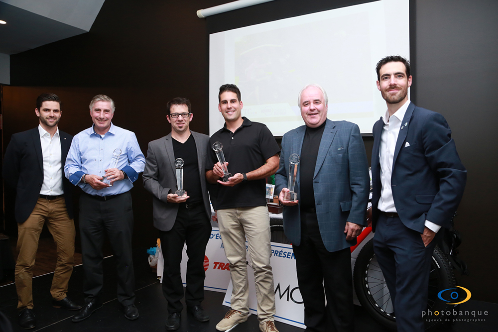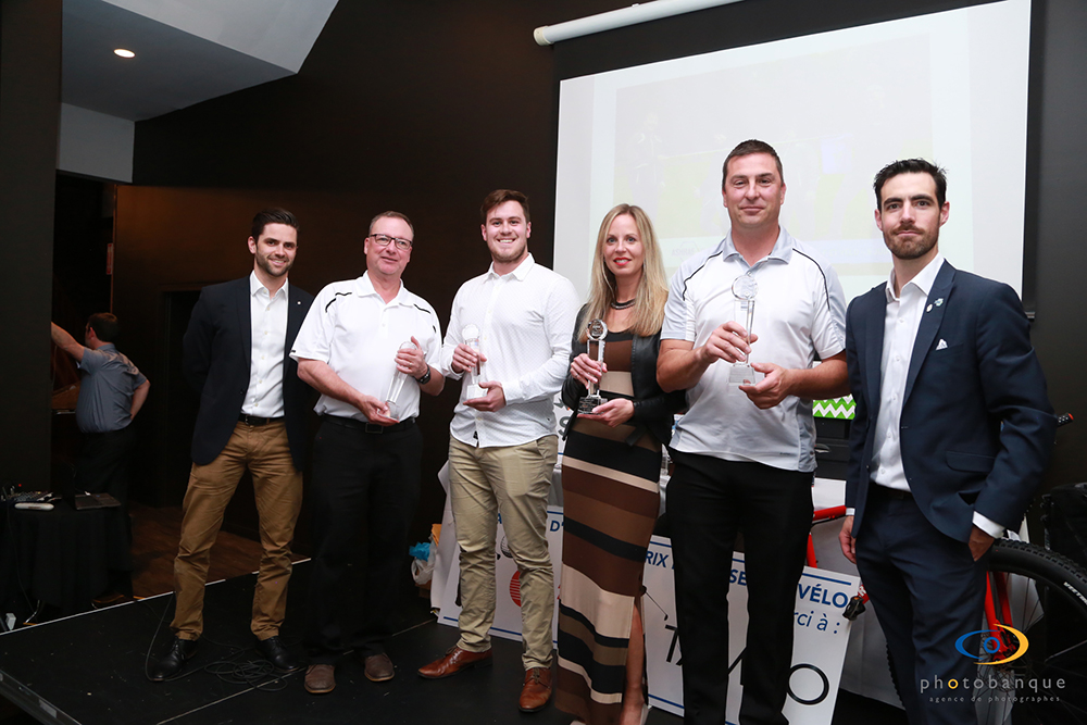 Entre Samuel Lavoie et Mathieu Rondeau, les gagnants : Ernie Trainor, François Guillemette, Julie Fortier et Yannick Gauthier.