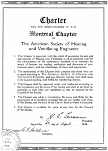 M. G. Lorne Wiggs est né à Québec le 1er juillet 1889 et obtient son diplôme d’ingénieur de l’Université McGill en 1921. Au début des années vingt, M. Wiggs habitait à Chicago et participait à de nombreuses réunions du chapitre ASHVE de l’Illinois et était membre junior de la société au printemps 1924. En 1929, M. Wiggs commença à pratiquer comme ingénieur conseil à Montréal et associé à la firme Wiggs, Walford, Frost et Lindsay, un des principaux bureaux de génie conseil à Montréal, pionnier et un grand innovateur de son époque. Le premier vice-président M. Ferd J. Friedman était membre d’ASHVE depuis 1921 et associé à la firme McDougall & Friedman, une firme de génie conseil qui se spécialisait dans les travaux commerciaux, industriels et institutionnels. C’était l’un des plus importants bureaux, durant ces années, à Montréal pour la réalisation de projets majeurs.
