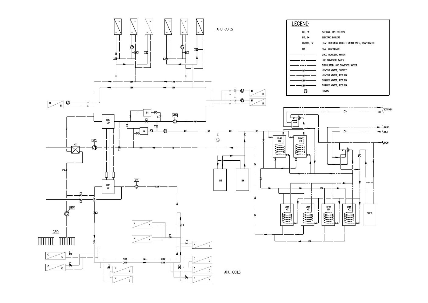 Figure 4: Chilled and hot water hydronic circuits showing new pipework in bold