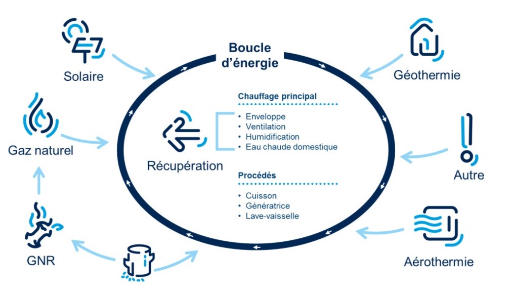 - Diversité et récupération de chaleur : une boucle permettra généralement de tirer le meilleur de chaque source d’énergie. À titre d’exemple, au Québec, il ne serait pas surprenant d’avoir une stratégie profitant de la robustesse et de la puissance de chauffage offerte par le gaz naturel, tout en utilisant aussi la performance des technologies de thermopompage. Si ces deux sources d’approvisionnement sont les bases du concept, on devrait tout de même s’attendre à ce que le plan d’opération vise l’intégration de sources renouvelables en temps venu, qui auront chacune leurs forces diverses (biomasse, solaire, récupération de chaleur de centres de données ou des eaux usées, etc.).