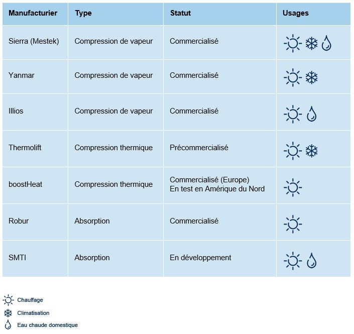 Enfin, on trouve aujourd’hui des thermopompes à gaz naturel à compression thermique, une technologie en développement, bien que des thermopompes de ce type soient déjà commercialisées en France et utilisent le CO2 comme réfrigérant. Aux États-Unis, Thermolift est en phase de précommercialisation d’une thermopompe à compression thermique utilisant l’hélium et a amorcé un projet de démonstration en Colombie-Britannique, auprès de clients résidentiels et commerciaux.