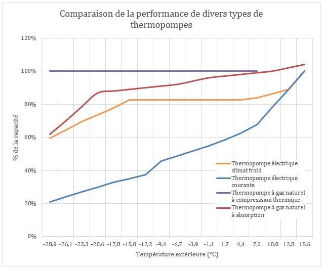 Contrairement aux thermopompes électriques, qui requièrent un système de chauffage d’appoint pour conserver leur capacité par temps froid, les thermopompes à gaz naturel sont en mesure de maintenir leur capacité même par grand froid, comme le montre la figure 1. La compagnie Thermolift publie des résultats qui montrent une capacité de 100 % sur toute la plage de température et une efficacité stable supérieure à 130 %.