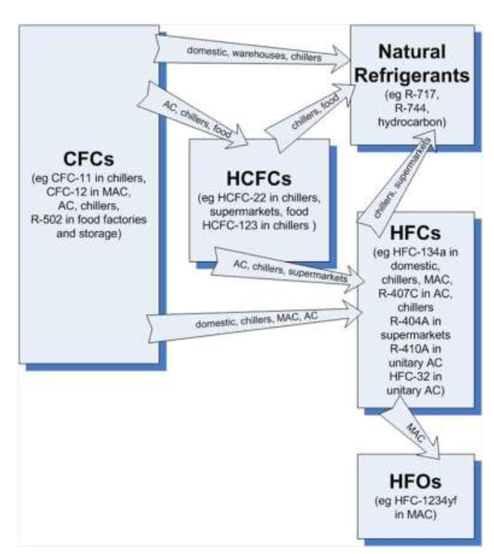 « Au cours de l’histoire de la climatisation et de la réfrigération, de nombreuses substances ont été utilisées comme réfrigérants. Or, ces dernières années, il est devenu plus complexe de faire un choix. En effet, certains réfrigérants des premières générations, soit les chlorofluorocarbones (CFC) et les hydrochlorofluorocarbones (HCFC), ont contribué à l’appauvrissement de l’ozone stratosphérique et sont par conséquent progressivement éliminés en vertu d’un accord international. Les CFC et les HCFC ont majoritairement été remplacés par les hydrofluorocarbones (HFC); certains de ces HFC ont cependant un potentiel de réchauffement climatique (PRC) élevé et, dans un contexte de changement climatique mondial, leur utilisation est de plus en plus contrôlée dans certains pays européens. Récemment, de nouveaux HFC (appelés hydrofluorooléfines ou HFO) ayant un PRC plus bas ont fait leur apparition. Ils ont un potentiel de destruction de l’ozone (PDO) nul et un PRC très bas, mais certains d’entre eux sont légèrement inflammables. »