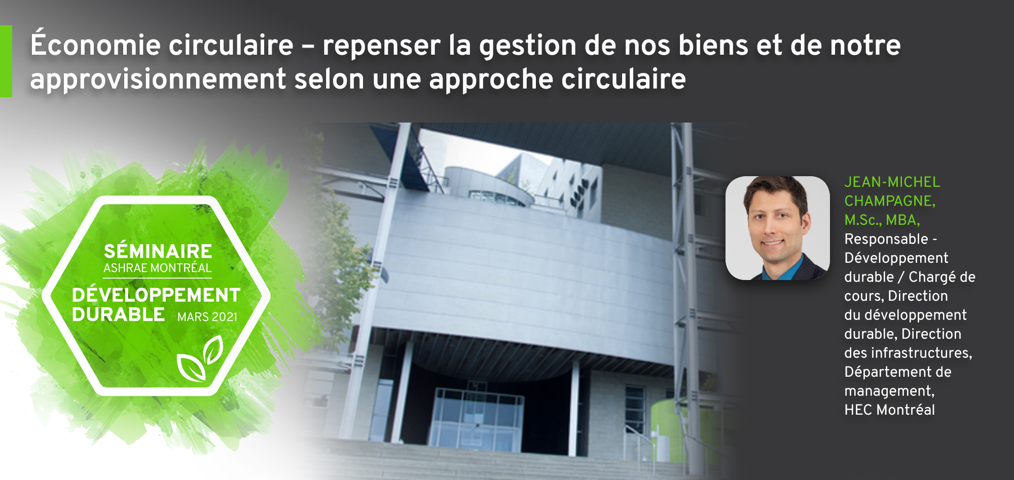 Jean-Michel Champagne, M.Sc., MBA est responsable du développement durable ainsi que chargé de cours à HEC Montréal, à la Direction du développement durable, Direction des infrastructures, Département de management.