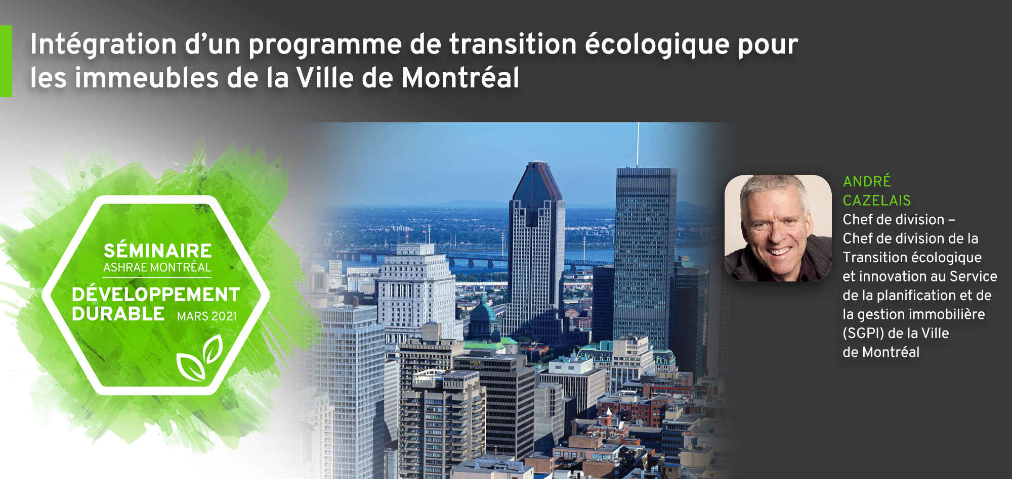 M. Cazelais est le chef de la division de la transition écologique et de l’innovation (DTEI) créée en 2019. Cette division du Service de la gestion et de la planification immobilière (SGPI) a pour mission d’amener le SGPI vers la transition écologique. La SGPI assure la gestion des budgets d’énergie de plus de 500 bâtiments, dont 265 sont déjà décarbonés et 21 sont approvisionnés en gaz naturel renouvelable.