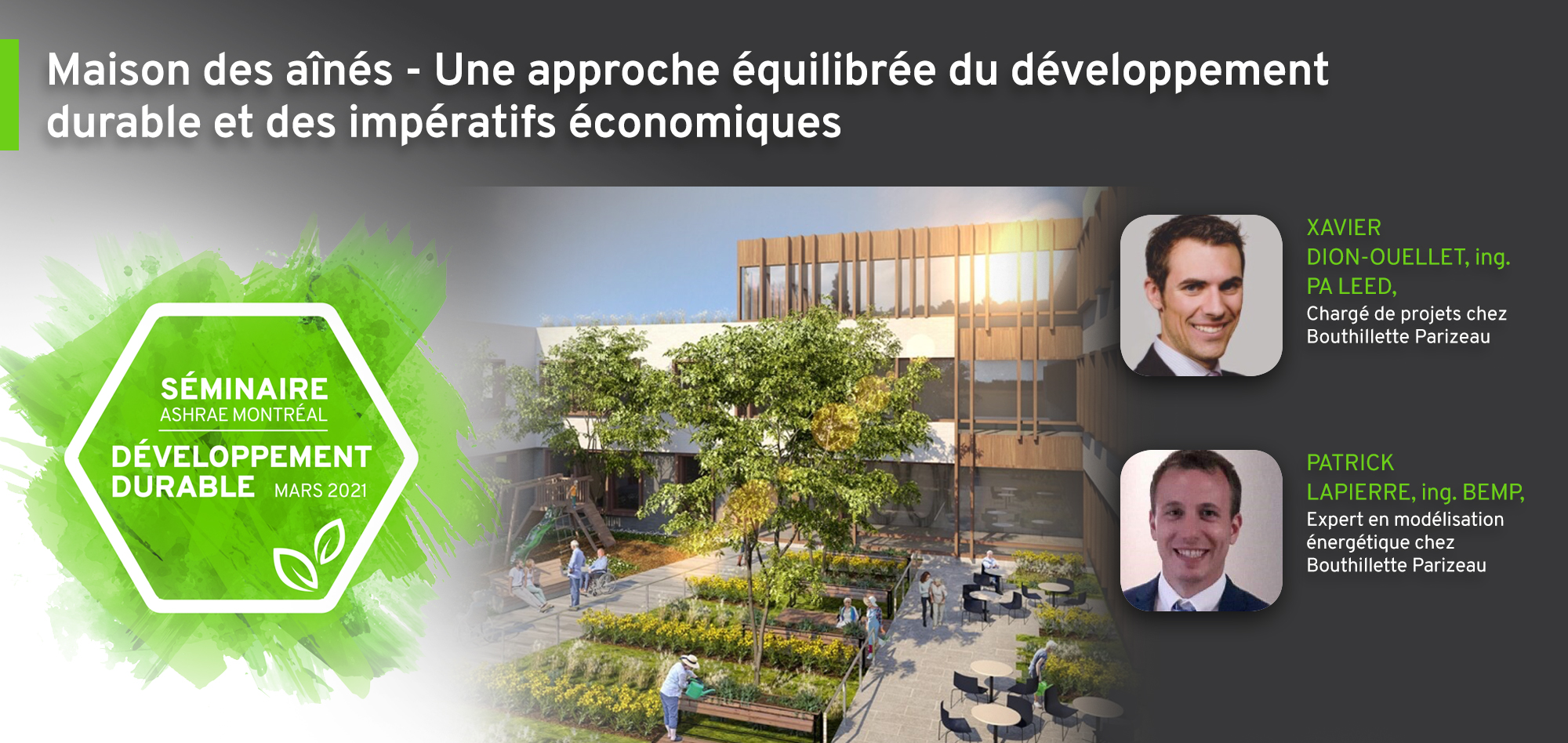 Lors de l’édition 2021 du Séminaire Développement Durable ASHRAE Montréal, Bouthillette et Parizeau nous a présenté un projet porteur pour le Québec, soit le projet des Maisons des Aînés. Ce projet comporte 46 bâtiments répartis dans toutes les régions du Québec et ajoutera 3 420 lits pour nos aînés. Un investissement total de plus de 1,5 milliard $. Ces bâtiments visent des certifications LEED et le respect du PACC2020.