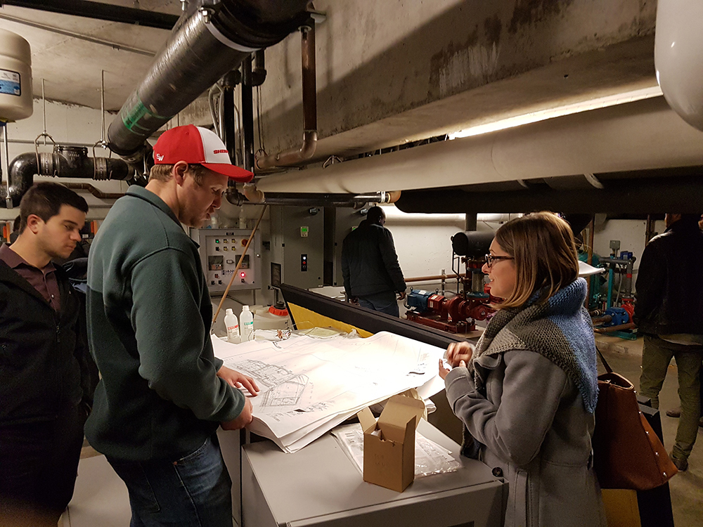 L’activité a permis de visiter les laboratoires, les systèmes de ventilation, les systèmes de récupération d’énergie, la tuyauterie des puits géothermiques, la tuyauterie du système de chauffage radiant et d’autres.