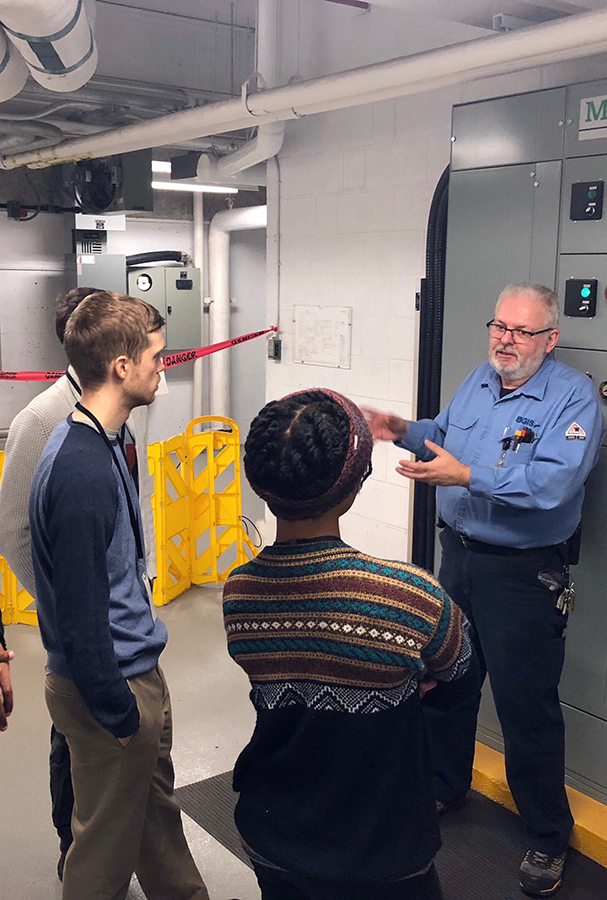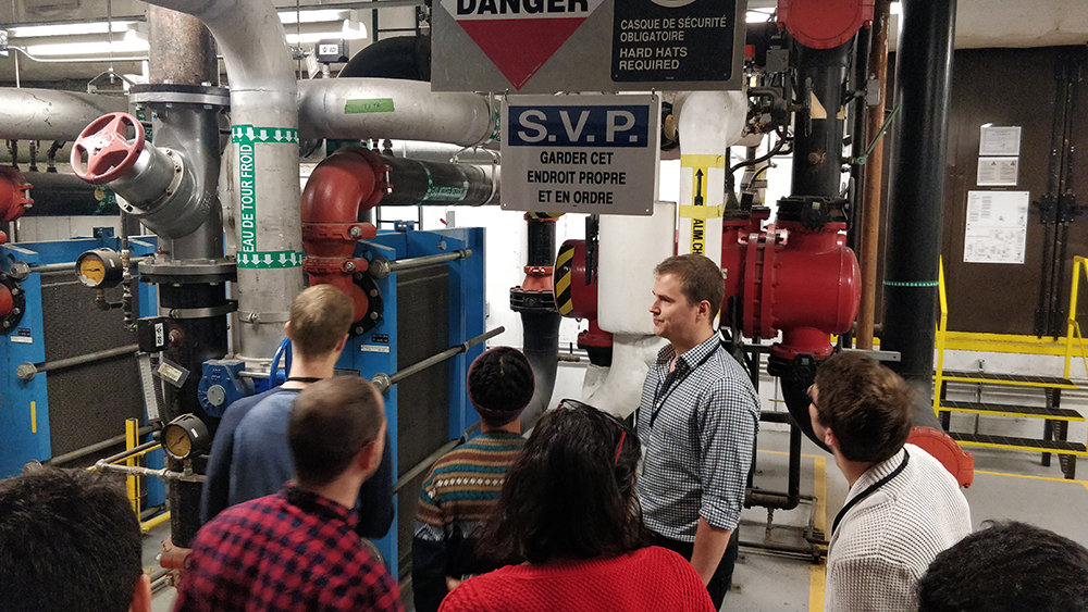L’activité fut un succès et a attiré des étudiants du CEGEP et des universités, ainsi que quelques membres YEA. Après une présentation technique, nous avons visité les salles mécaniques et électriques, les tours d’eau, la chaufferie et les salles des génératrices. Nos guides nous ont expliqué comment la boucle d’eau mitigée utilise la récupération de chaleur pour fournir l’air frais, le chauffage et le refroidissement du bâtiment de manière efficace. Nous avons aussi pu voir les stratégies de récupération de chaleur pour le préchauffage d’eau domestique.