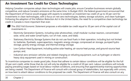 M. Lindsay a débuté sa présentation en mentionnant que les gouvernements des États-Unis ainsi que du Canada offrent désormais un crédit d’impôt aux entreprises qui utilisent des technologies de stockage d’énergie de l’ordre de 30% du coût d’implantation. L’annonce Canadienne a été faite lors du dépôt du budget en 2022 (Fall Economic Statement 2022) et reprise dans le budget 2023 en ajoutant les systèmes géothermique aux investissements visés (Budget 2023).