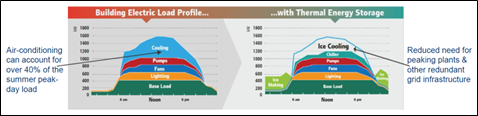 Afin de réaliser la décarbonation des bâtiments, M. Lindsay préconise particulièrement le stockage d’énergie obtenu par des banques à glace combinés à des thermopompes. Cette combinaison permet selon lui d’offrir une flexibilité d’opération en capturant et stockant de l’énergie récupérée pour chauffer les bâtiments et en optimisant le fonctionnement des thermopompes.
