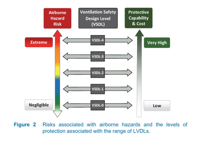 M. Perreault explique l’utilité du document de classification des niveaux de laboratoire (Classification of Laboratory Ventilation Design Levels) émis par ASHRAE dans le design des systèmes. Ce document a pour but d’aider les propriétaires et concepteurs dans leur planification, de rendre les bâtiments plus sécuritaires, d’identifier des critères de conception selon les besoins et les niveaux de risques de chaque laboratoire. M. Perreault précise que ce document doit être utilisé conjointement avec une analyse de risque effectuée par un professionnel. Comme illustré sur l’image ci-dessous, on distingue 5 niveaux allant de niveau VSDL-0 (faible risque) à VSDL-5 (risque extrême).