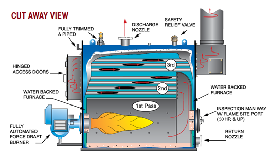 - Les chaudières tubes à feu « Firebox », pour des puissances de 300 HP et plus lorsque le biogaz ou l’huile usée sont disponibles. À noter qu’il faut garder suffisamment d’espace autour de la machine pour remplacer les tubes lors de l’entretien;