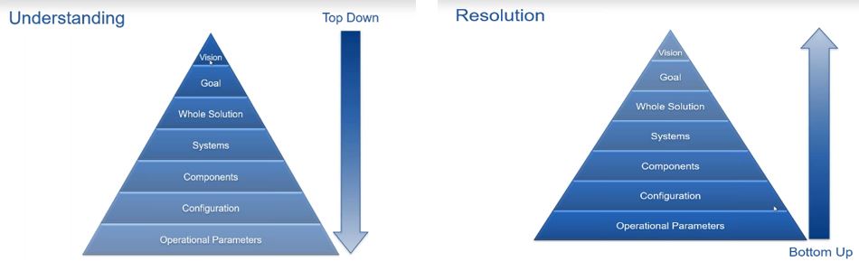 Pour M. Gulledge, la philosophie de design est simple: il faut comprendre tous les éléments en partant de la vision, de l’objectif, jusqu’aux paramètres d’opération soit du haut vers le bas dans la pyramide ci-bas et il faut résoudre en partant du bas vers le haut.