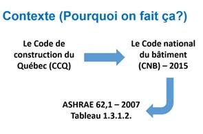 M. Di Pietro a débuté la présentation en parlant du la norme ASHRAE 62.1-2007 qui est utilisée dans le Code national du bâtiment et dans le Code de construction lorsqu’on parle de la ventilation (article 6.2.2.1).