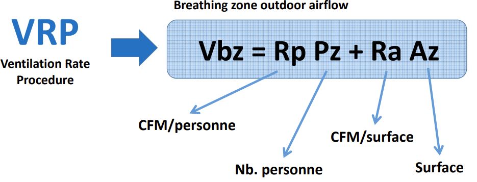 Nous avons regardé plus en détail la méthode VPR qui est l’une des principales méthodes d’ASHRAE 62.1 et la formule utilisée pour le calcul du débit d’air extérieur pour la zone de respiration est: