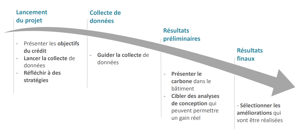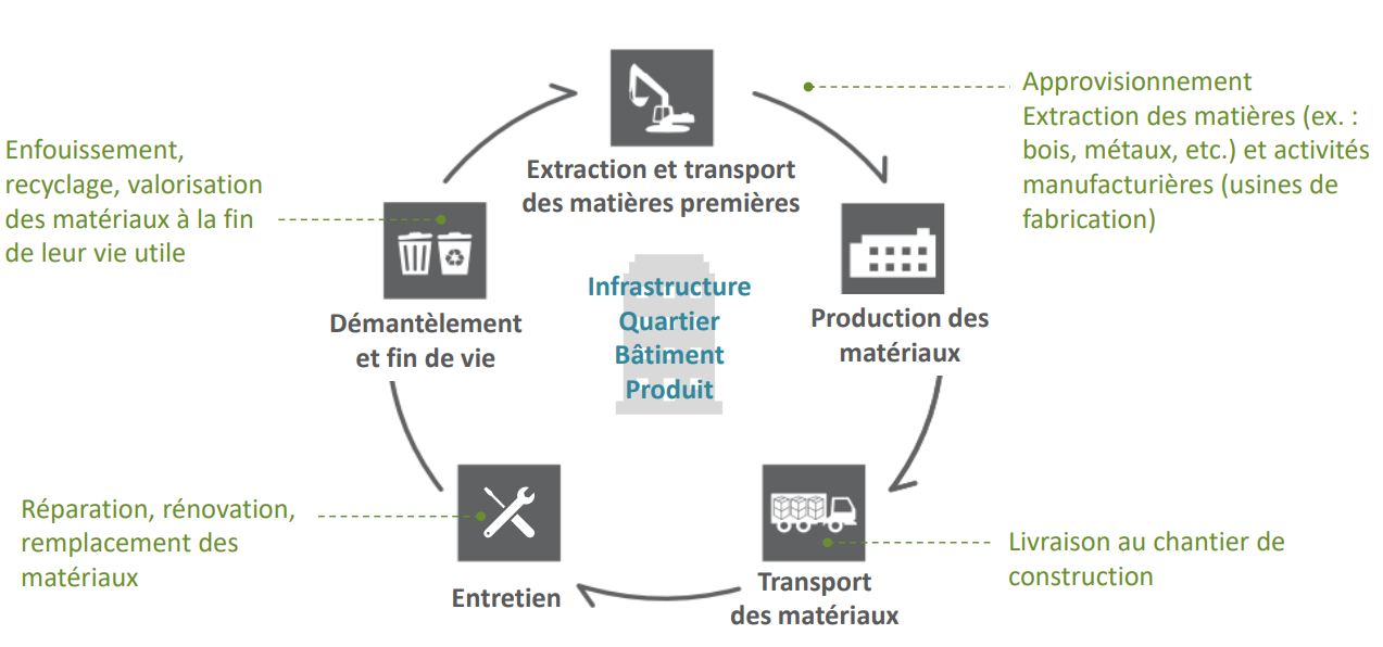 Où se situe le carbone intrinsèque? À l’étape de la production des matériaux, on parle de l’énergie pour extraire la matière (ex. bois, métaux) et des activités manufacturières (usines de fabrication). Lors de l’étape suivante du transport de ces matériaux de construction, il faut également colliger les émissions liées à ce transport. Lors de la construction, l’énergie liée à ces activités se trouve au niveau de l’utilisation d‘énergie (ex. la grue et le chauffage), mais également au niveau des résidus de construction. Lors de la maintenance, le remplacement ou l’entretien des matériaux sont également des activités émettrices de GES. Finalement, en fin de vie, on parle de déconstruction, réutilisation ou enfouissement où il faut quantifier les émissions.
