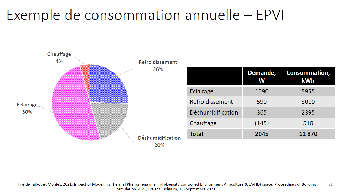 Le travail de Mme Monfet montre que l’éclairage constitue la moitié de la consommation annuelle de l’EPVI (voir image 6), le refroidissement et la déshumidification étant les 2 autres sources principales.