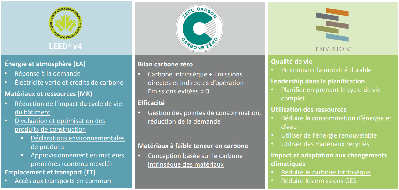 Mme Chayer nous a présenté comment trois certifications spécifiques tiennent compte du carbone dans leur certification tel que présenté ci-dessous.