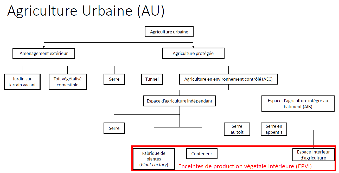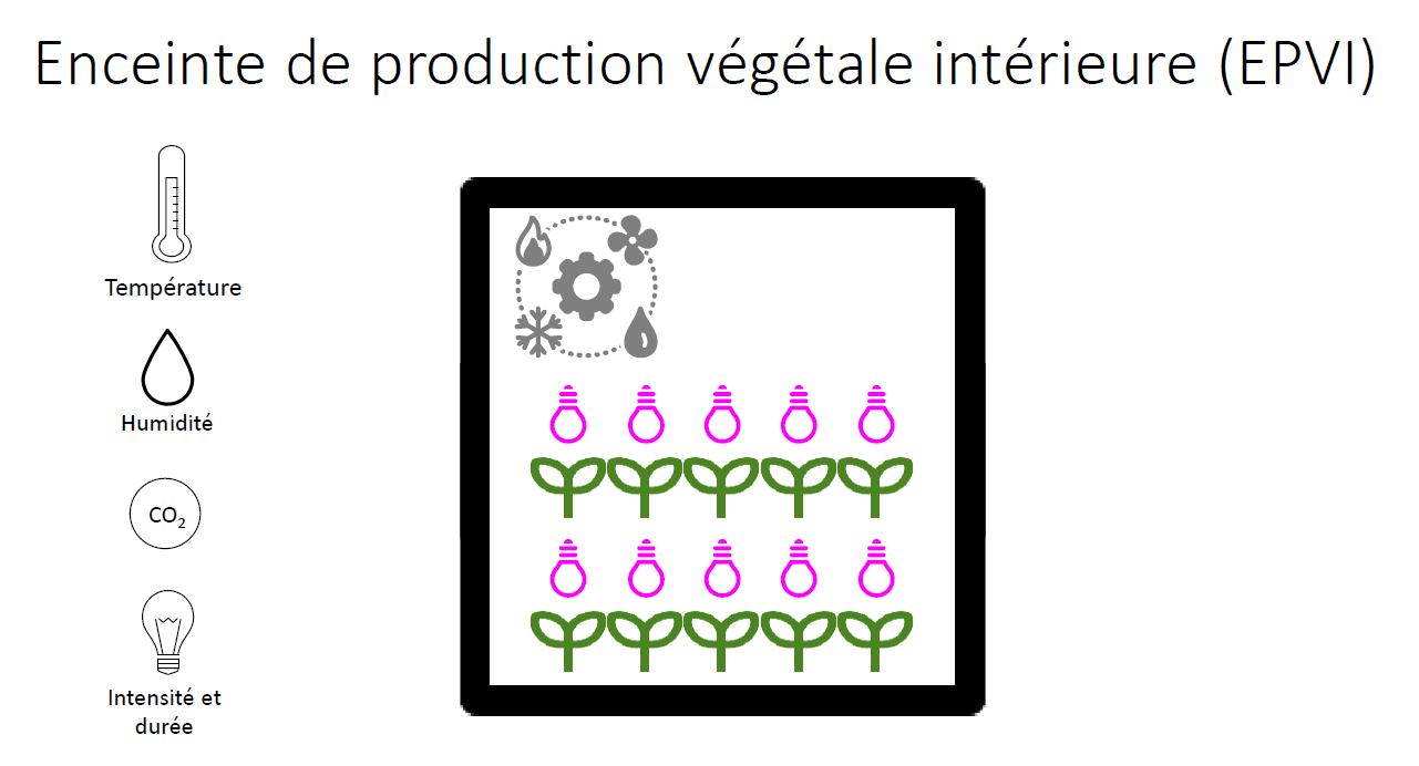 Les enceintes de production végétale intérieure sont de trois types, soit les fabrique de plantes (en anglais plant factory), les conteneurs et les espaces intérieurs d’agriculture. Ceux-ci se distinguent des serre qui disposent généralement d’une grande source de lumière naturelle et de la possibilité d’apport d’air importants par des ouvertures ou des fenêtres (voir image 1). Les EPVI offrent plusieurs avantages pour le Québec comme un meilleur rendement, une densité de production élevée, une réduction de l’empreinte au sol et un approvisionnement en végétaux plus local. Les EPVI pourront faire partie des solutions en agriculture urbaine qui suscite de plus en plus d’intérêt puisqu’elle offre une solution à plusieurs enjeux sociétaux actuels : la densification des villes, l’augmentation de la demande alimentaire, la promotion de l’économie locale, la réduction du transport.