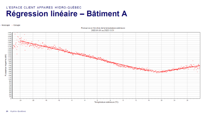 Ces informations permettent ensuite de réaliser différentes analyses. Ces dernières sont pertinentes pour optimiser le fonctionnement du bâtiment, des opérations et des systèmes. Elles peuvent permettent d’identifier des problématiques récurrentes ou spontanées. M. St-Cyr a présenté différents graphiques tirées des données téléchargées pour illustrer son propos.