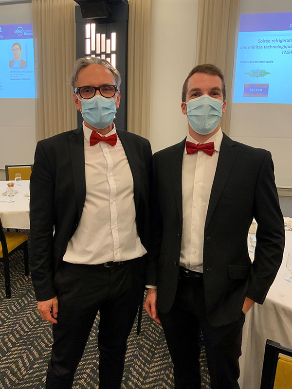 Lors de la soirée Prestige Énergir pour notre souper du 8 novembre dernier, nous avons eu la chance de recevoir bon nombre d’étudiants. Le concept de notre bénévole, Sami Maksoud d’Énergir, était d’avoir des étudiants sur presque toutes les tables afin de leur permettre d’échanger avec les acteurs du milieu de la mécanique du bâtiment. Dans la photo ci-dessous, nous apercevons Benjamin Lacroix de l’Université de Sherbrooke en compagnie du conférencier M. Daniel R. Rousse. Ils abordaient même tous deux le nœud papillon rouge, sans le vouloir! Merci de ta participation Benjamin, ce fut un plaisir d’échanger avec toi.