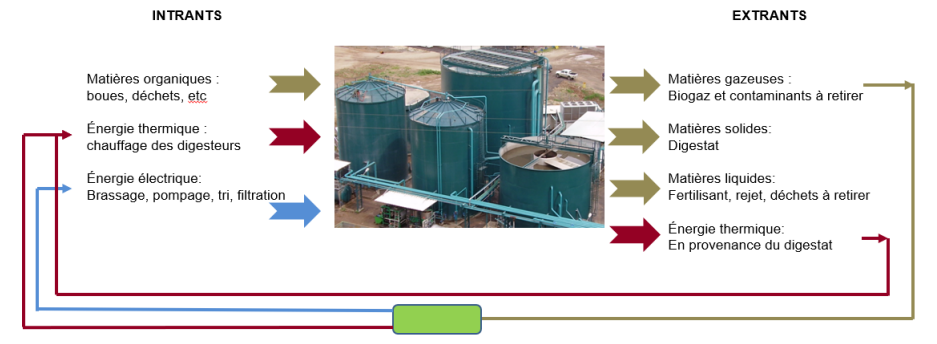 M. Rousse nous a présenté les intrants et extrants d’un procédé de biométhanisation tel que représenté dans l’image ci-dessous.