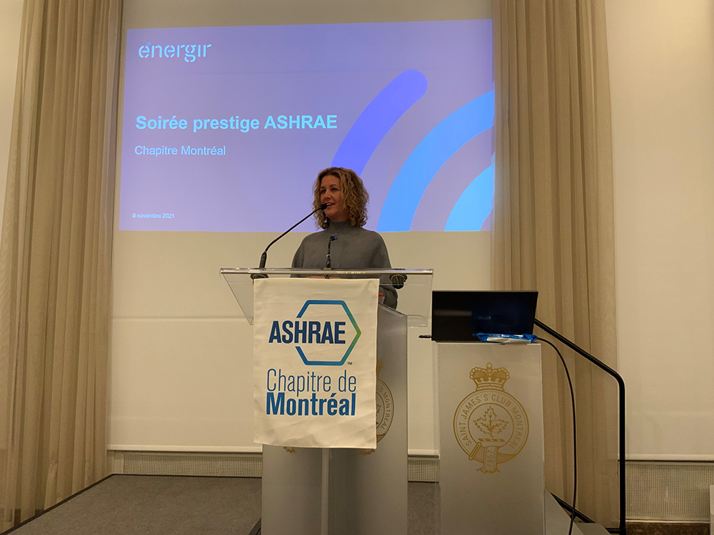 Le mot ouverture, présenté par Brigitte Samson, Directrice exécutive groupe Datech, Ventes & développement de marché, mentionnait: C’était un plaisir de vous tous vous revoir (en vrai) à cette soirée Prestige Énergir ASHRAE Montréal. Votre réaction positive envers notre plan d’action pour un Québec meilleur nous encourage à continuer nos efforts à vous supporter dans vos projets. Vous faites partie de la solution et vous êtes les principaux acteurs qui nous aideront à atteindre nos objectifs en lien avec l’accroissement de nos efforts en efficacité énergétique. Comme je l’ai mentionné, si vous n’avez qu’une seule chose à retenir ce soir, c’est la suivante : Énergir a beaucoup de GNR à distribuer dès maintenant et pour longtemps. Le processus est maintenant simple et rapide.