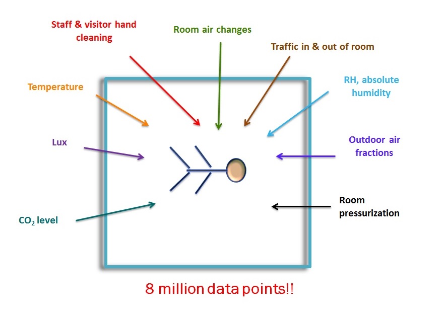 Mme Taylor poursuit son exposé en nous parlant des recherches sur l’impact de la qualité de l’environnement intérieur des édifices sur la santé. Des études révèlent que plus de 10 % des patients hospitalisés sont affectés par une infection associée aux soins de santé (ou en anglais HAI – Healthcare-associated infection), c’est-à-dire une infection développée par le patient pendant qu’il reçoit un traitement médical dans un centre de soins de santé. Mme Taylor et son équipe a donc mené une étude d’un an, dans un hôpital donné, afin de faire la corrélation entre les conditions de vie intérieures et le développement de nouvelles infections chez les patients. Ils ont donc recueillis diverses données de la chambre de patients à toutes les 30 minutes pendant 1 an (voir image 5).