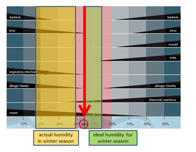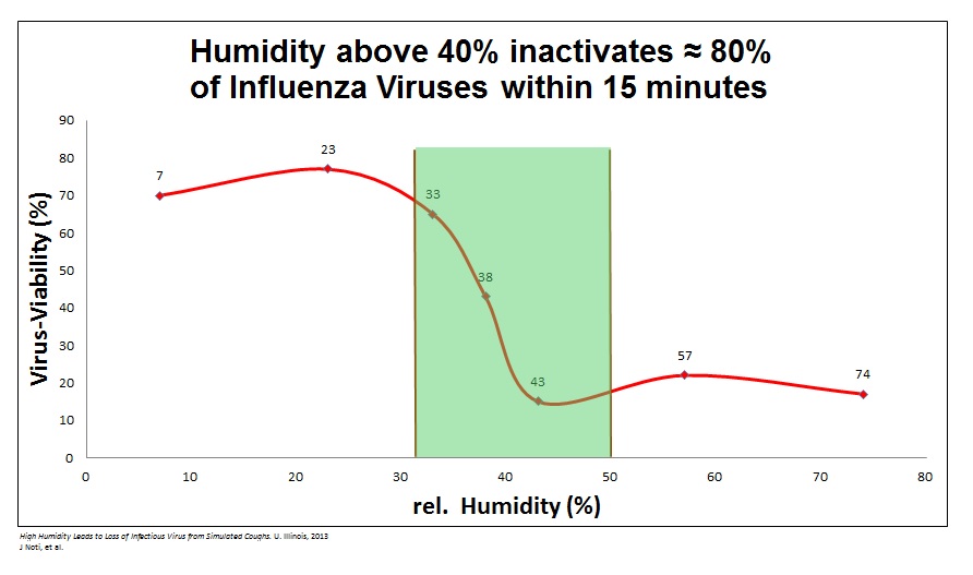 De plus, Mme Taylor précise que lorsque l’air est sec, il est plus difficile pour notre corps d’empêcher les microbes de pénétrer dans nos voies respiratoires. De surcroît, plus les microbes descendent loin dans les bronches et les poumons, plus nous sommes malades (par ex. sinusite vs bronchite vs pneumonie). Elle ajoute aussi que les bébés et les aînés sont plus vulnérables aux effets négatifs d’une trop basse humidité de l’air ambiant. Et à l’inverse, les pathogènes adorent l’air sec! Ils ont une meilleure transmission dans l’air, une durée de vie prolongée, peuvent pénétrer plus facilement dans le corps humain et sont plus difficiles à éliminer par le lavage des surfaces. Mme Taylor explique que lorsque nous toussons, les goulettes émises sont de l’ordre de 0,5 à 100 microns. Plus une goulette est petite, plus elle flottera dans l’air longtemps, jusqu’à 41 heures pour 0,5 microns et seulement 6 secondes pour 100 microns. Lors que l’air est entre 40% et 60% HR les gouttelettes s’évaporent moins vite et se déposent rapidement sur les surfaces qui peuvent être désinfectées. Par contre, lorsque l’humidité est moindre, les goulettes s’évaporent et réduisent en taille ce qui leur permet de rester en suspension dans l’air plus longtemps, d’être entrainées par la ventilation et de re-contaminer les surfaces plusieurs heures après leur nettoyage.