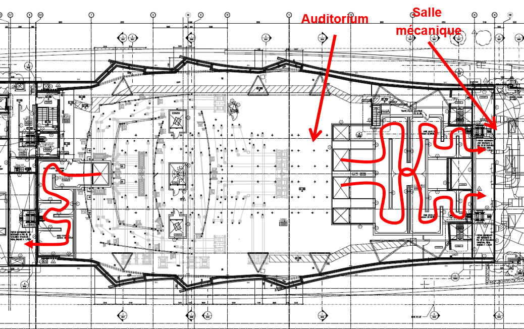 Après la structure, la conception et la mise en œuvre des systèmes mécaniques ont eux aussi posés de grands défis. Il s’avère qu’il n’existait pas d’équipement sur le marché rencontrant les exigences accrues du critère de bruit N1. En combinant le critère N1 et l’exigence que et le confort thermique des spectateurs, il fût nécessaire de développer de nouveau produits construits sur mesure pour ce projet. Le système de ventilation développé repose sur un ensemble de ventilateurs à entraînement direct et en parallèle ce qui permet la redondance et nécessite moins d’entretien et permet d’opérer à des fréquences sonores qui sont plus faciles à atténuer. De plus, l’alimentation d’air dans la salle se fait par des plenums acoustiques sous les sièges. La pression dans les plenums est maintenue à 15 Pa et la vitesse de l’air aux sièges est de 0,5 m/s (100 pi/min). Le système de ventilation n’utilise aucun ventilateur de retour et l’air retourne à la salle mécanique par un réseau de plenums en serpentin appelé « tube digestif » (voir image 3). Les dimensions du « tube digestif » sont telles qu’aucun bruit provenant de la salle mécanique ne s’en échappe. Les sons les plus graves, dont les longueurs d’ondes sont grandes peuvent y être atténués grâce aux changements de direction des conduits. Le tube fût optimisé à l’aide de l’analyse par éléments finis et fait en sorte qu’aucun silencieux n’a été ajouté.