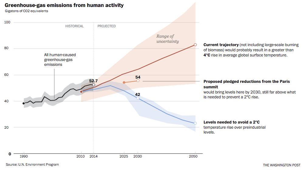 Lors de la conférence de Paris de 2015 sur le climat, le sujet des émissions de gaz à effet de serre a été traité. M. Mayrand nous résume. La tendance (cf. figure 3) montrait une augmentation de la température de la planète de 4°C d’ici 2050. Dans un souci d’infléchir cette tendance, des engagements de réduction ont été proposés pour se limiter à 54 gigatonnes de CO2 équivalents consommés en 2030. Toutefois, cette mesure est encore loin d’être suffisante pour ralentir l’augmentation de 2°C, souhaitée par la communauté scientifique pour éviter des phénomènes d’amplification.