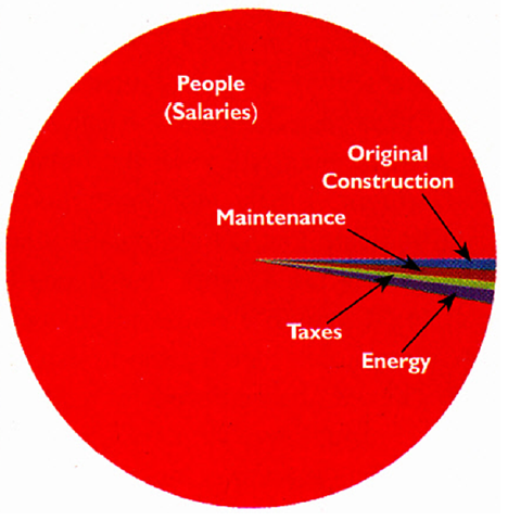 Selon lui 4 choses doivent être sous-pesées pour déterminer si une solution est avantageuse du point de vue économique: les coûts initiaux du projet, la dépense énergétique qui sera engendrée chaque année, les salaires (productivité) des employés qui occupent l’édifice et les frais associés au cycle de vie. Actuellement, aux États-Unis, on évalue les frais d’installation des systèmes de CVCA à 35 $/pi2 pour les espaces de bureaux, à un peu plus dans le cas des centre de santé, et un peu moins, soit 20 $/pi2 pour les centres commerciaux. Toujours aux États-Unis, on estime les coûts de chauffage et de climatisation à 2 $/pi2 en moyenne. Ce chiffre diminue si du refroidissement naturel (freecooling) peut être utilisé. Il faut également considérer les coûts associés aux occupants de l’édifice, soit la masse salariale. Si on considère une surface de 150 pi2 par occupant, on obtient une masse salariale moyenne de 300 $/pi2 par année. C’est donc dire que sur la durée de vie d’un bâtiment, le salaire des occupants coûte largement plus cher que tous les autres types de dépenses (cf. image 3).
