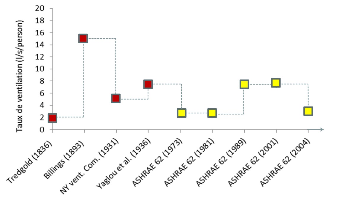 C’est dès 1836 que les premières recommandations relativement à la ventilation ont fait leur apparition. Mr. Tredgold proposait un taux minimum de 4 PCM/personne afin d’évacuer les rejets métaboliques et compenser pour la combustion des bougies. Jusqu’à 1936, suivant les travaux de Yaglou, plusieurs taux de ventilation ont été proposés, allant de 4 PCM/pers. jusqu’à 30 PCM/pers. (cf. Image 1). En 1936, Yaglou propose un taux de 15 PCM/pers., taux basé sur le contrôle des odeurs corporelles. À cette époque, le niveau de CO2 était utilisé en tant qu’indicateur du niveau de bioeffluent. La norme ASHRAE 62, basée sur les travaux de Yaglou, fait son apparition en 1973 et a été révisée à plusieurs reprises depuis pour éventuellement devenir une référence mondiale sur les taux de ventilation.