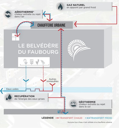 • Une thermopompe centralisée à chaque immeuble procurant chauffage, eau froidie, et préchauffage de l’eau domestique;