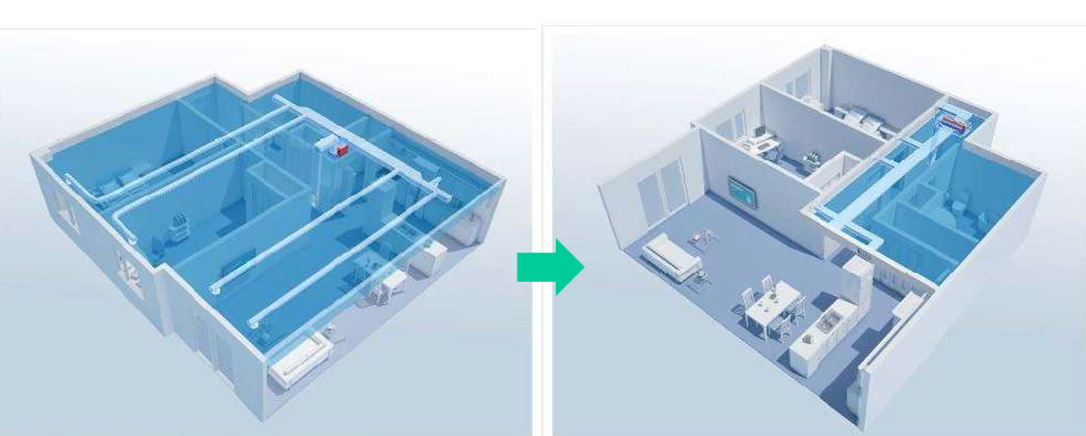 La solution CVAC initiale des immeubles utilisait des ventilo-convecteurs VRF (Variable Refrigerant Flow), installés dans les couloirs pour l’accès facile, avec deux diffuseurs dans chaque unité résidentielle. En 2014, Énergir a publié les résultats de l’étude du Centre de technologies du gaz naturel (CTGN) sur les conduits minimalistes. Cette étude a démontré qu’il était possible de diffuser l’air chaud ou froid à partir du haut du mur opposé à la surface vitrée sans diminuer le confort (critères énumérés par la norme ANSI/ASHRAE 55-2010) comparé au chauffage par l’air chaud grâce à des bouches de diffusion positionnées le plus près possible des fenêtres au plancher ou au plafond. Ceci permet de réduire la longueur nécessaire des conduits d’air.
