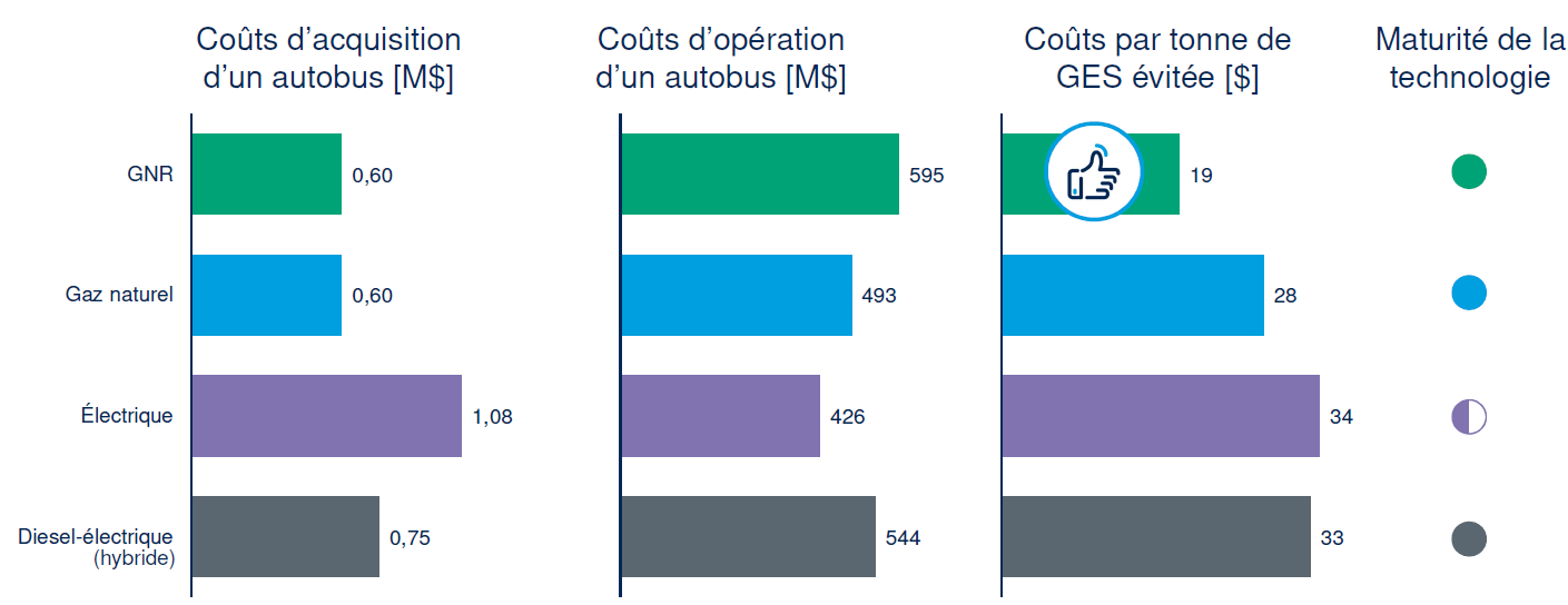 Malgré l’investissement important, les autobus au GNR représentent la seule solution mature et complètement verte aujourd’hui qui maximise les GES évités et le service au citoyen. La figure plus bas présente les avantages d’utilisation de cette technologie et on observe que le coût par tonne de GES évitée (19$/tonne GES) est le plus bas pour le GNR (exemple de Paris, Los Angeles, Toronto) comparé au gaz naturel, électrique ou diesel-électrique.