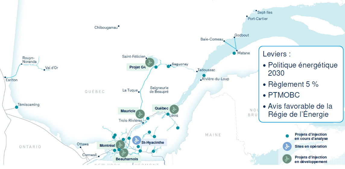 Au Canada, Énergir développe l’injection de GNR sur l’ensemble de son réseau en prenant l’exemple des pays scandinaves. Pour répondre aux demandes de clients, il faut agir pour servir, alors Énergir est prêt à investir des efforts pour développer des projets de GNR avec les municipalités et les clients. Ainsi, depuis novembre 2017, l’usine de biométhanisation de Saint-Hyacinthe fonctionne et cela représente le premier projet municipal de biométhanisation au Québec dont les volumes de gaz naturel renouvelable produits sont injectés dans le réseau d’Énergir. Plusieurs projets municipaux prennent forme, l’objectif étant d’augmenter la production de GNR et la bio-méthanisation.