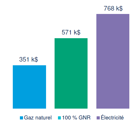 M. Johnson mentionne que le tarif nous permet d’avoir une économie qui est très intéressante et nous présente un exemple de facture annuelle d’un client institutionnel consommant l’équivalent de 1 M m3 de gaz naturel. On peut observer que, même si nous consommons 100% du GNR, le coût de la facture est moindre que celle pour l’électricité.