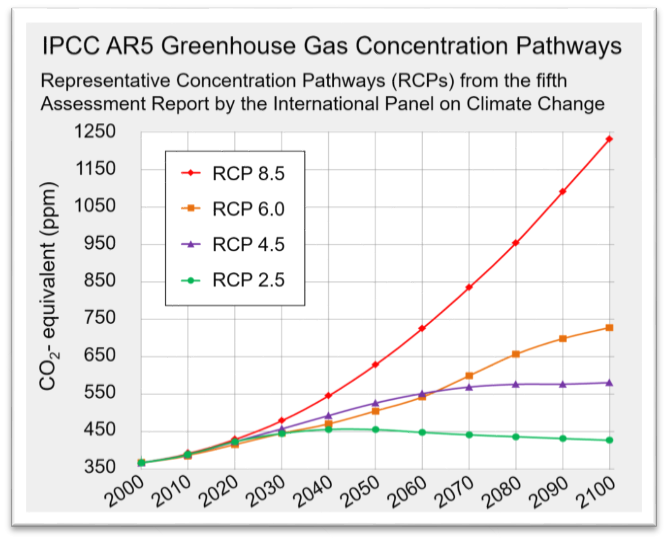 Bien qu’on ne s’oriente possiblement pas vers le scénario le plus pessimiste, les récentes évaluations indiquent que RCP2,6 ne serait pas le plus probable, mais plutôt entre RCP4,5 et RCP6 indiquant une hausse moyenne de la température de 2,4oC à 3oC.